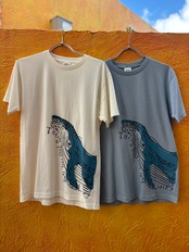 バックプリントには大洋を旅して沖縄の海に立ち寄るクジラのように、沖縄が人生という旅の休憩場所であったらいいな、という思いを込めた詩をプリントしました。
